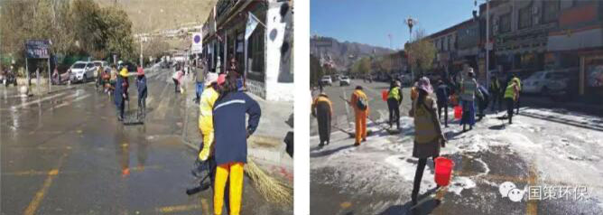 當(dāng)天11:00~17:00,我公司出動(dòng)大型灑水車2輛、人行道洗地車1輛、環(huán)衛(wèi)工人及管理人員共45人對(duì)扎寺廣場(chǎng)和珠峰西路(扎寺廣場(chǎng)至體育路路口)的路面進(jìn)行沖洗,共計(jì)出動(dòng)灑水車8車次,沖洗面積達(dá)20000平方米,耗資15000元。