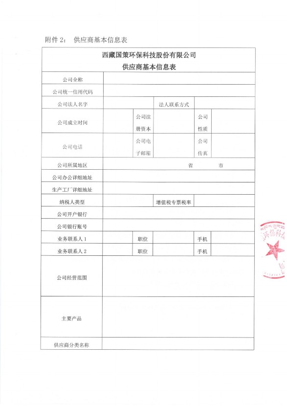供應商將資料整理成冊并每頁蓋章后掃描為PDF文件,發(fā)送至西藏國策環(huán)保科技股份有限公司采購郵箱:cg@guoce.com。