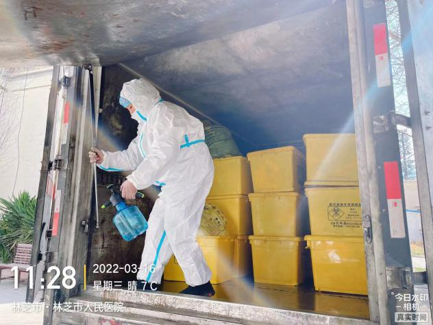 2、消殺完畢后,立即出發(fā)前往林芝市新冠定點醫(yī)院(林芝市人民醫(yī)院)收集轉(zhuǎn)運新冠相關(guān)醫(yī)療廢物,與林芝市人民醫(yī)院醫(yī)廢暫存間工作人員確認稱重并規(guī)范填寫危險廢物轉(zhuǎn)運聯(lián)單,收集完畢后對轉(zhuǎn)運車內(nèi)外進行消殺;